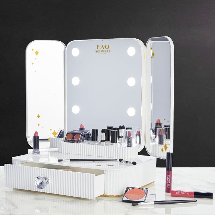Every little girl needs her first makeup kit! Teach her how to apply blush, polish her nails or add sparkle to her eyes with the 24-Piece LED Vanity Makeup Studio from FAO Schwarz! But more than that, you’ll show your child or friend how to unleash artistic creativity with the right tools for them! All the pieces she needs for crafting her new look from start to finish are included. This set features foundation, primer, blush, lipstick, nail polish, brushes, and a mirrored vanity to keep it all in. To get started on your makeover, we’ve included a makeup application sheet with tips for mastering your desired look. Lighting is key to producing a glowing look! Insert batteries (not included) into the back of the tri-fold vanity mirror to provide your child with extra lighting. A small button on the back turns the light on and off to preserve battery power.