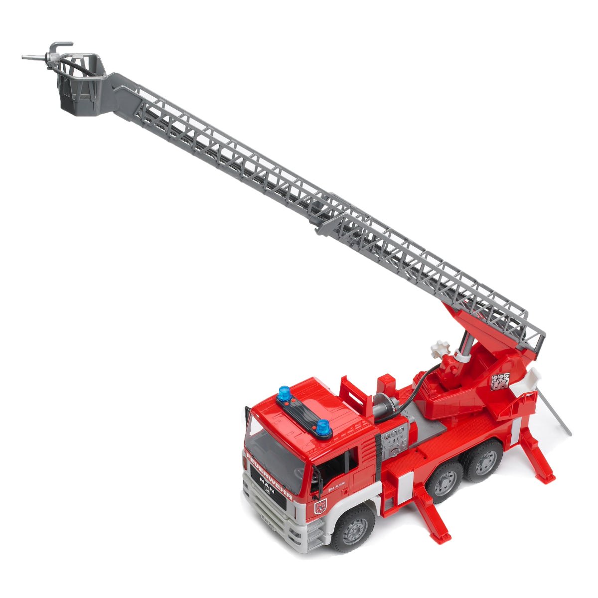 It’s a good thing that the fire brigade is here and that is of course also the case in toy land. This Bruder MAN TGA fire truck is a very complete ladder truck, complete with light and sound module, working water pump and extendable ladder. The fire truck is based on the MAN TGA truck and the entire driver`s cabin of the fire truck can be tilted, so that you can also see the engine of the truck. The fire truck has a water tank that you can fill and pump you can then spray real water. The ladder of the fire truck is extendable, so you can also extinguish fires at great heights. The ladder can be operated manually with the rotary knob. The Bruder firefighters have real rubber tread tires. Bruder toys have a scale of 1:16 and therefore the various Bruder vehicles and accessories can be easily combined and exchanged. This way you can create your own game world.