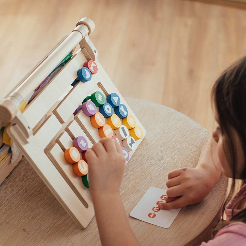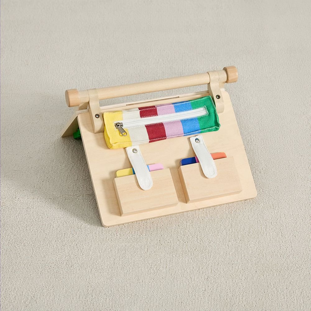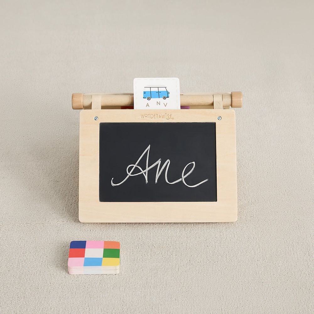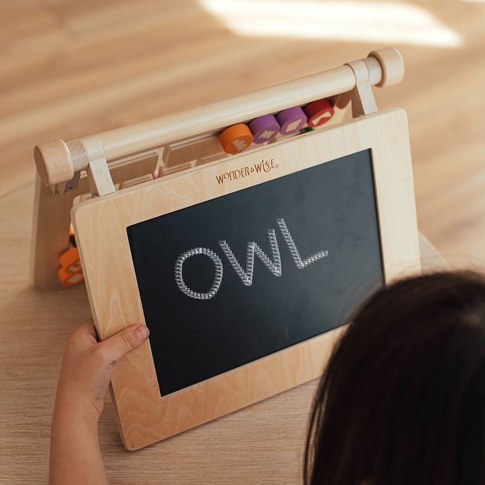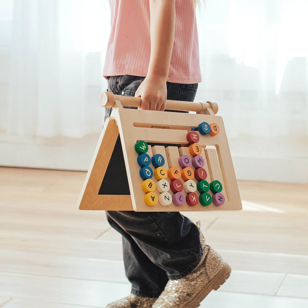 On the go, or at home, Spellbinder is the perfect toy for your child to play and learn. Spellbinder has four panels; spelling labyrinth with sliding letters, shape labyrinth with sliding shapes, a chalkboard that also serves as a portable writing & drawing surface, and storage pockets for cards, chalk, pencils, markers & more. Spellbinder helps teach spelling with 26 alphabet cards and 15 spelling cards, and sequencing with 12 shape cards. This all-in-one fun board folds completely flat that can be carried easily in the car, on a plane, or to a friend’s house. Fall under the spell! • Age: 3+ Years • Dimensions: 11.6 x 2.3 x 9.6 2.2 lbs • Materials: Plywood, cotton canvas and cardboard • Four-in-one design: sliding-letter spelling maze, shape labyrinth, chalkboard & storage pockets for cards and art supplies. • Includes 26 alphabet cards, 15 spelling cards & 12 shape cards to reinforce literacy and sequencing. • Folds flat for travel—perfect for car, plane or playdates!