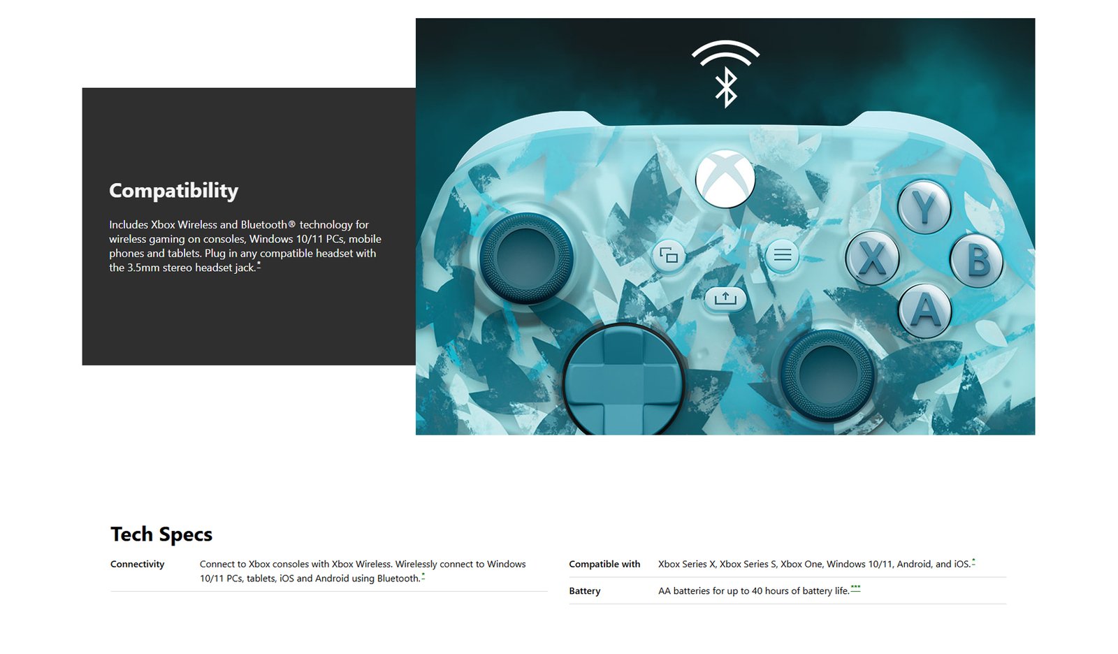 Textured triggers and bumpers | Frosty mix of iced and frosted blues | Hybrid D-pad | Button mapping | Bluetooth® technologyTextured triggers and bumpers | Frosty mix of iced and frosted blues | Hybrid D-pad | Button mapping | Bluetooth® technology